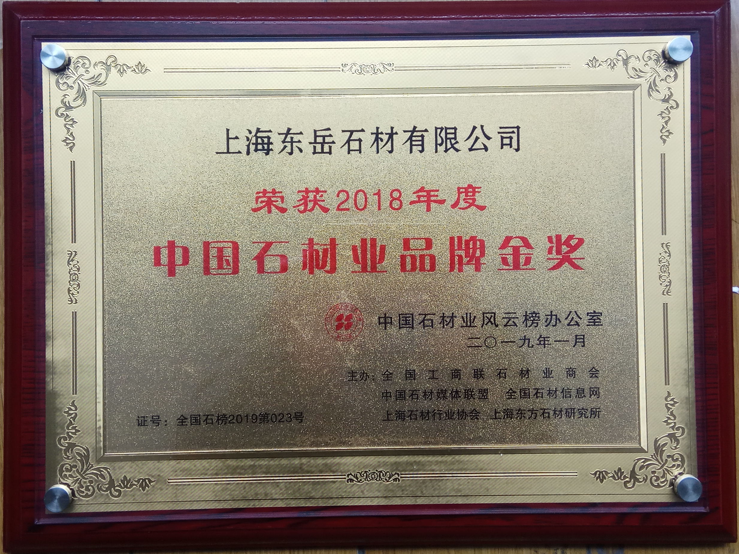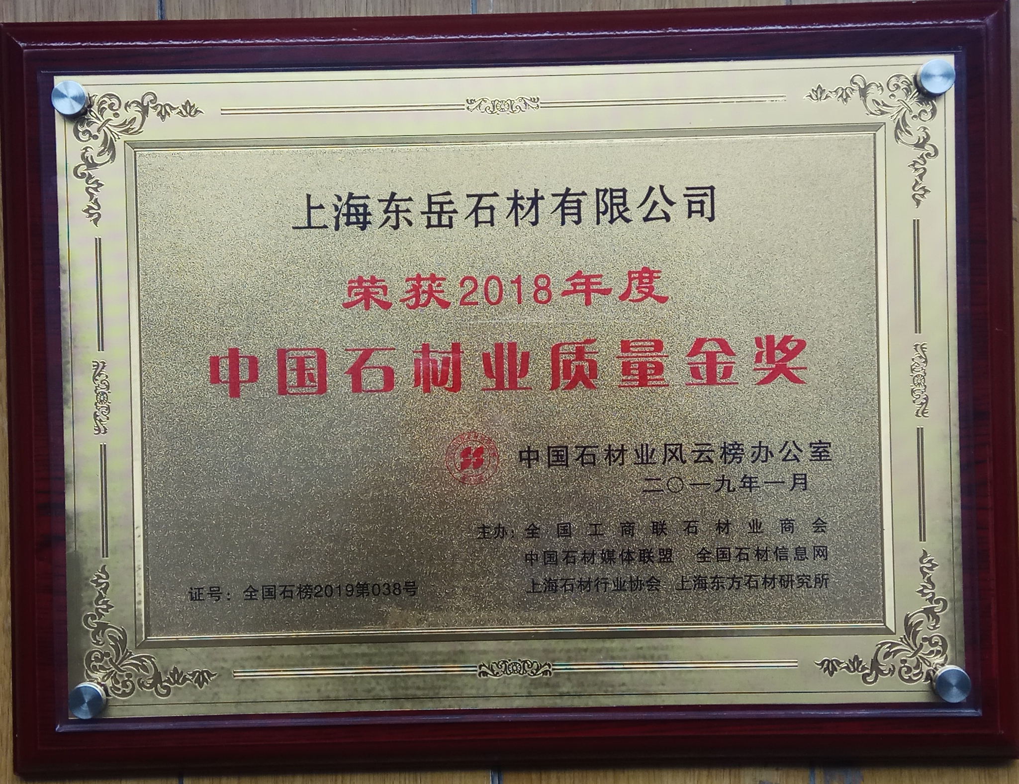 上海東岳石材有限公司榮獲2018年度石材行業(yè)品牌金獎、2018年度石材行業(yè)質量金獎、2018年度石材業(yè)誠信經(jīng)營先進單位,這是全體東岳人共同努力、共同奮斗的結果,也是業(yè)界對我們的肯定,希望公司全體同仁繼續(xù)加油!