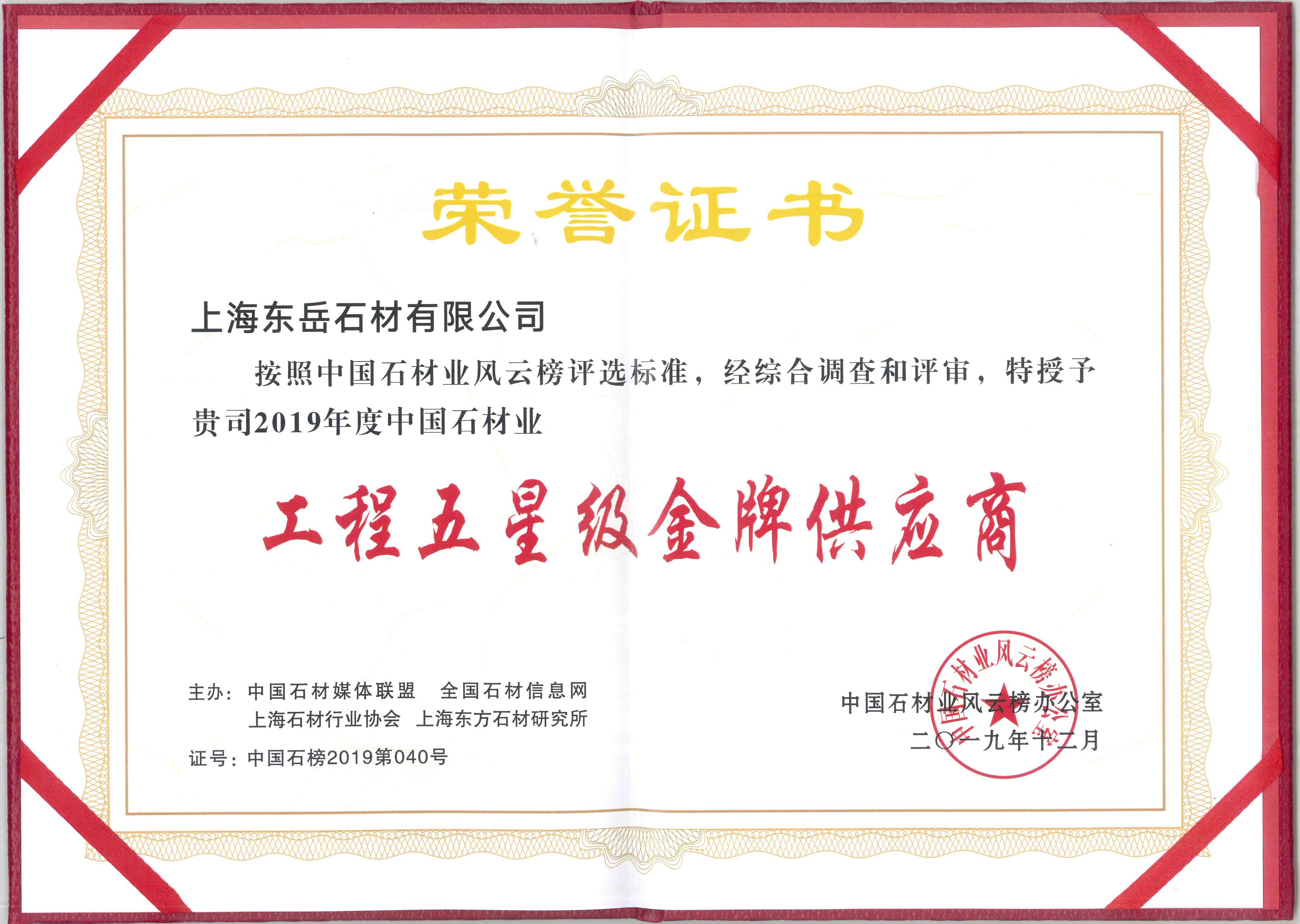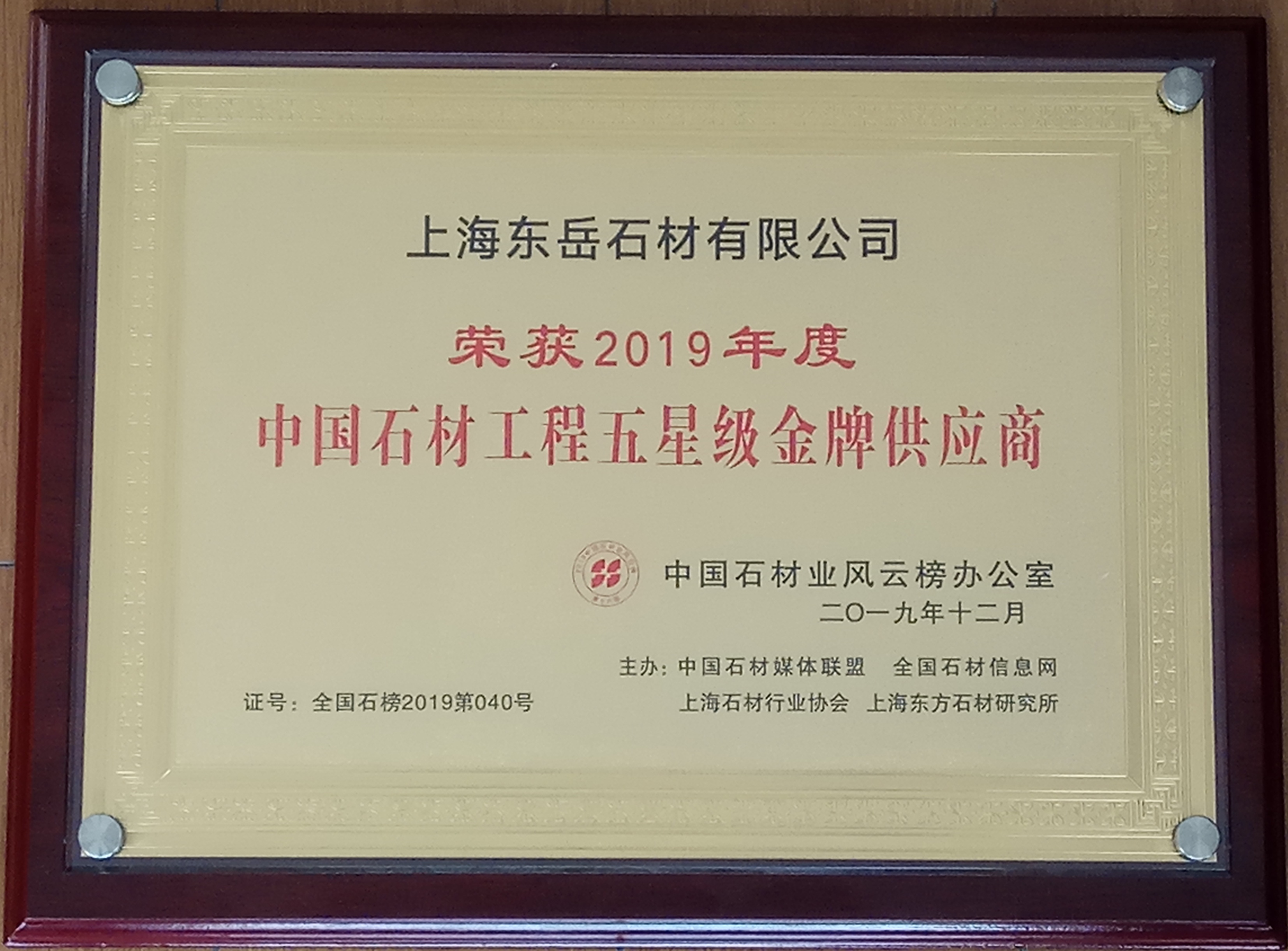 上海東岳石材有限公司榮獲“工程五星級金牌供應(yīng)商”稱號,這是石材行業(yè)對東岳工程質(zhì)量的認(rèn)可和鼓勵,希望公司全體同仁繼續(xù)加油,爭創(chuàng)更好業(yè)績。